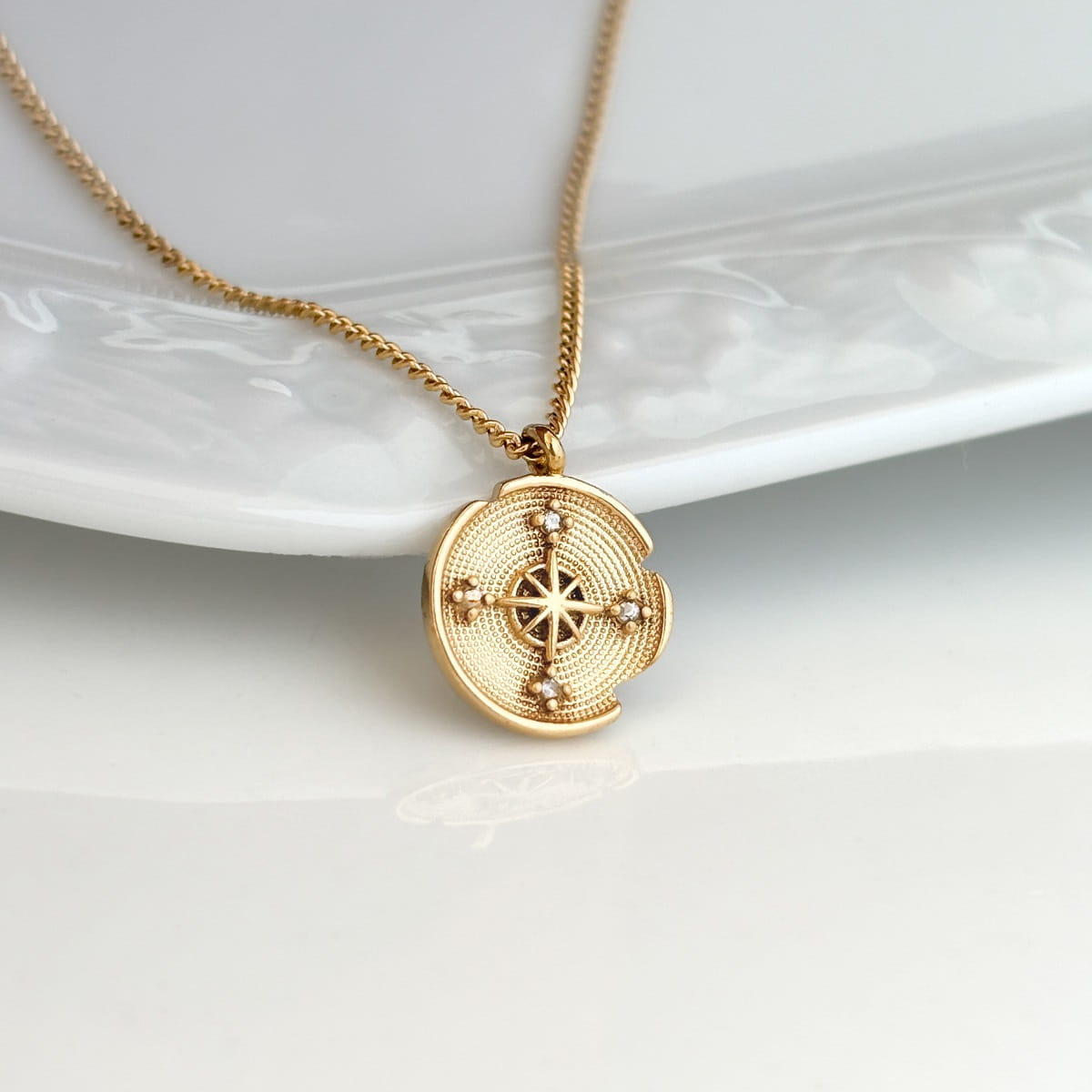 Naszyjnik z motywem róży wiatrów to biżuteria o wyraźnym znaczeniu, inspirowana podróżami, odkrywaniem nowych kierunków i podążaniem własną drogą. Subtelna zawieszka z delikatnymi cyrkoniami przyciąga światło i dodaje całości eleganckiego charakteru.