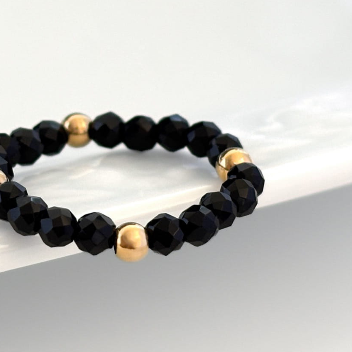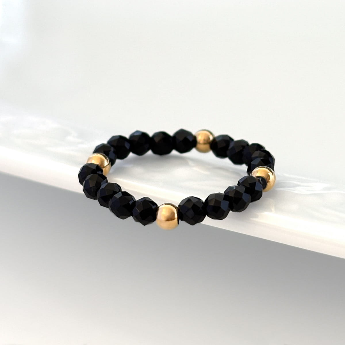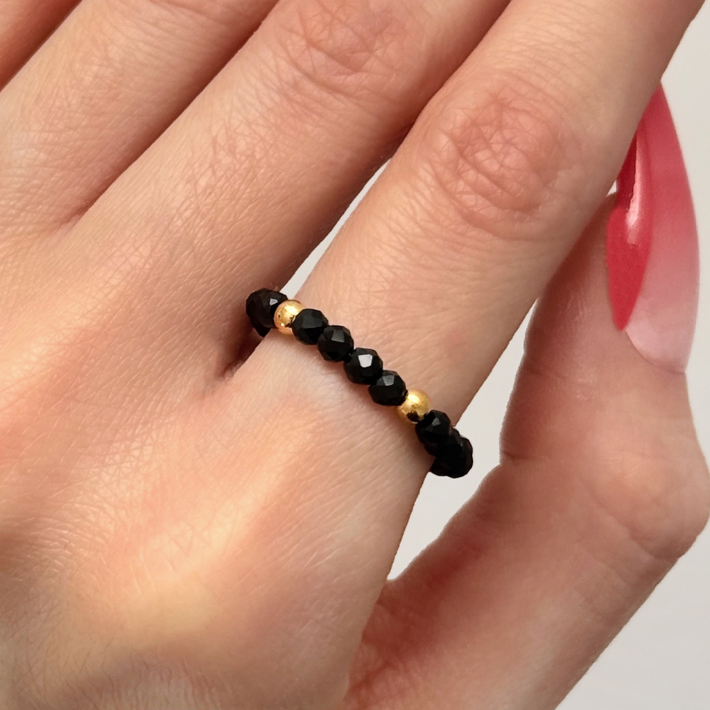 Subtelny pierścionek wykonany z fasetowanych koralików naturalnego turmalinu czarnego, który łączy elegancję z minimalistycznym stylem. Złocone koraliki ze stali chirurgicznej dodają blasku i wyrafinowanego charakteru, a elastyczna konstrukcja zapewnia komfort noszenia i łatwe dopasowanie do palca.